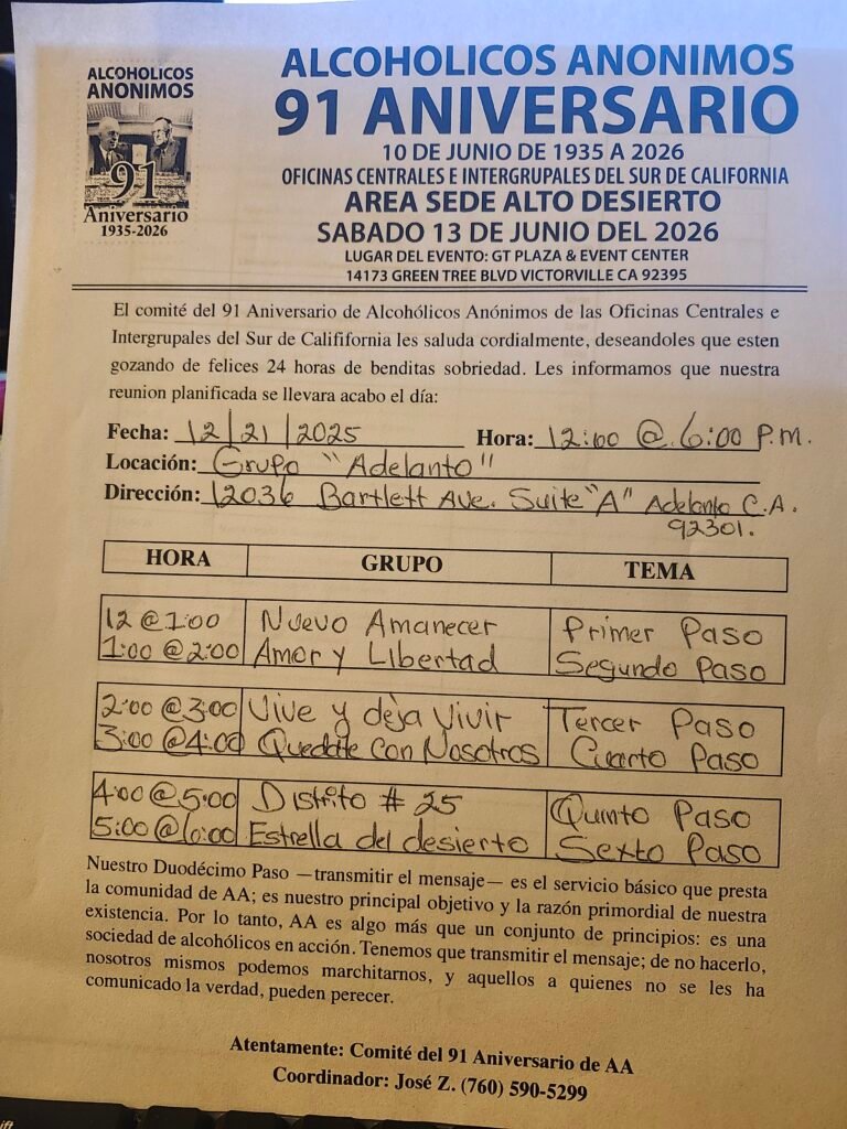 El Comite del “91” Aniversario de Alcoholicos Anonimos que se llevara a cabo el 2026 tiene a bien informar a todos los grupos de su proxima junta planificada,que tendra lugar en el local del grupo “La Luz del Sur” el dia 23 de Noviembre de las 12 del medio dia hasta las 6 de la tarde,con la participacion de 5 grupos y el Congreso del Inland Empire,estan todos invitados.